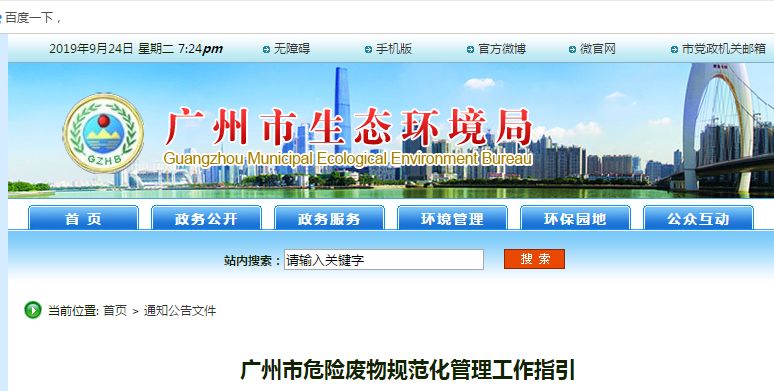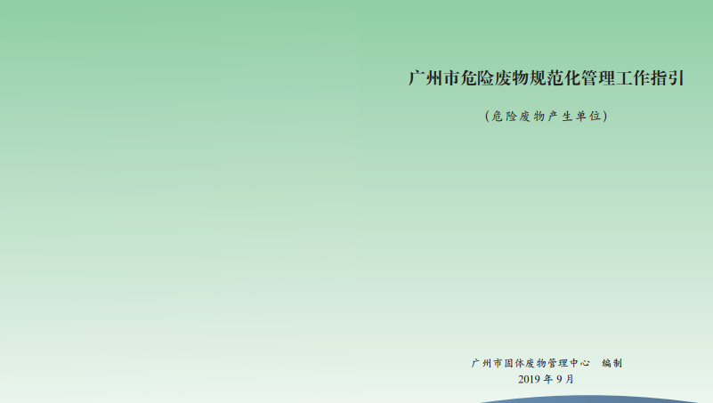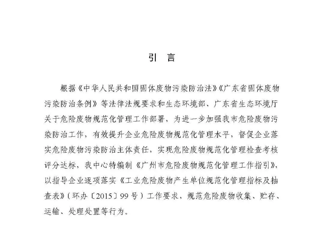 根据《中华人民共和国固体废物污染防治法》《广东省固体废物污染防治条例》等法律法规要求和生态环境部、广东省生态环境厅关于危险废物规范化管理工作部署,为进一步加强我市危险废物污染防治工作,有效提升企业危险废物规范化管理水平,督促企业落实危险废物污染防治主体责任,实现危险废物规范化管理检查考核评分达标,广州市固体废物管理中心特编制《广州市危险废物规范化管理工作指引》,以指导企业逐项落实《工业危险废物产生单位规范化管理指标及抽查表》(环办〔2015〕99号)工作要求,规范危险废物收集、贮存、运输、处理处置等行为。附件:《广州市危险废物规范化管理工作指引(危险废物产生单位)》.pdf